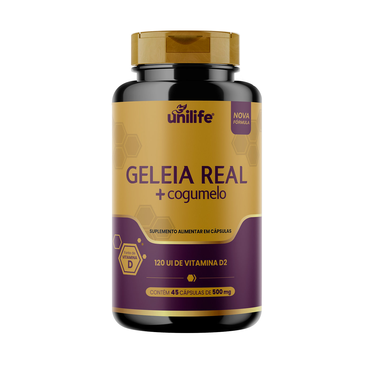 Ingredientes: Geleia real, pó de cogumelo, pó de cogumelo Agaricus Bisporus contendo vitamina D2 tratados com radiação UV, amido modificado e antiumectantes talco, dióxido de silício e estearato de magnésio. Cápsula: Gelatina vegetal e água purificada.