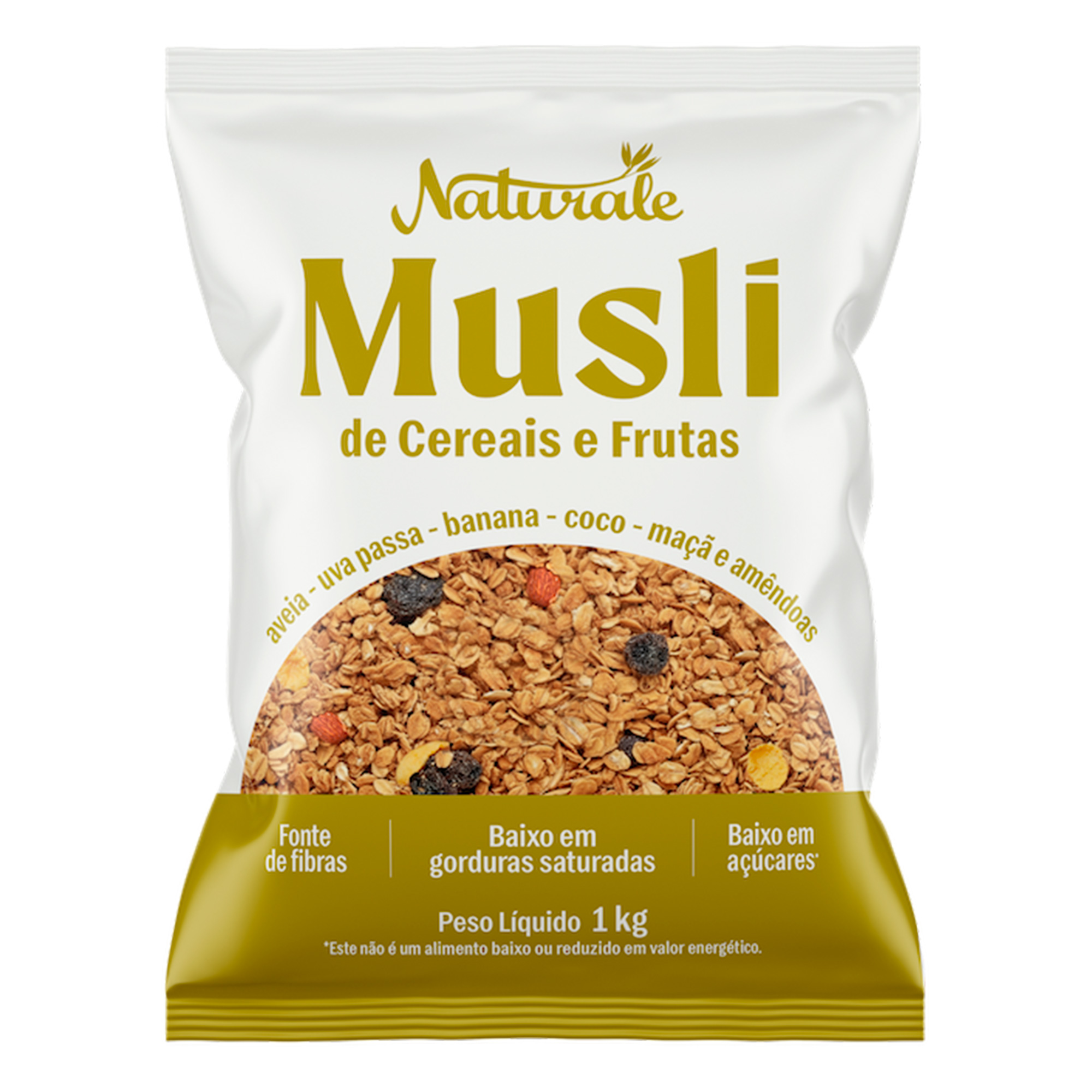 Flocos integrais de aveia, uvas passas, flocos de milho, banana desidratada, frutas cristalizadas (mamão e laranja em cubos), coco queimado em flocos, maçã desidratada e amêndoas.