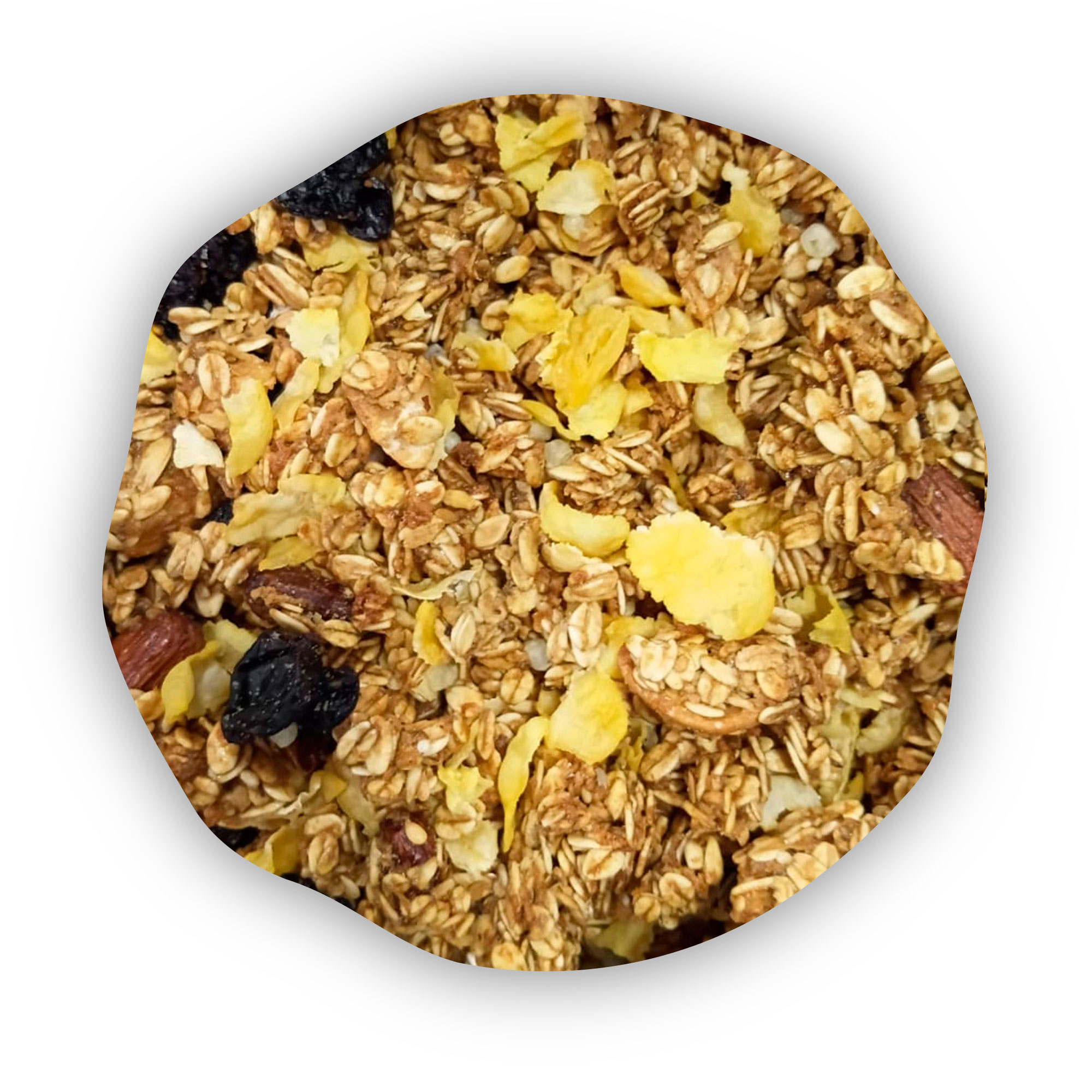 Ingredientes: Aveia, mix de nuts, melado de cana, farinha de aveia, flocos de arroz, flocos de milho, açúcar mascavo, coco, farelo de aveia, uva passa, semente de linhaça, gergelim, canela, bicarbonato de sódio e extrato de baunilha.