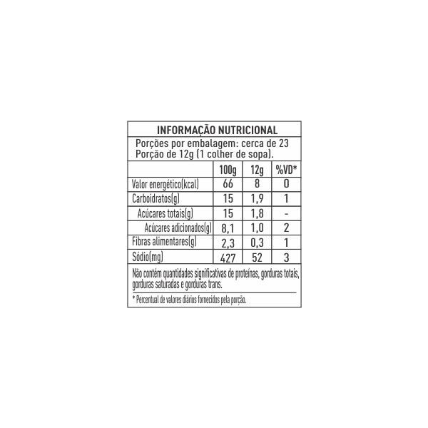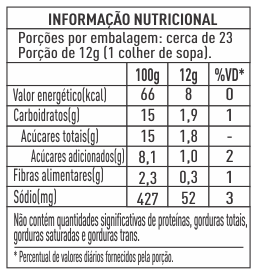 Tomate italiano*, polpa de tomate, açúcar*, vinagre*, açúcar mascavo*, sal rosa do Himalaia, cebola, alho e espessante goma xantana.