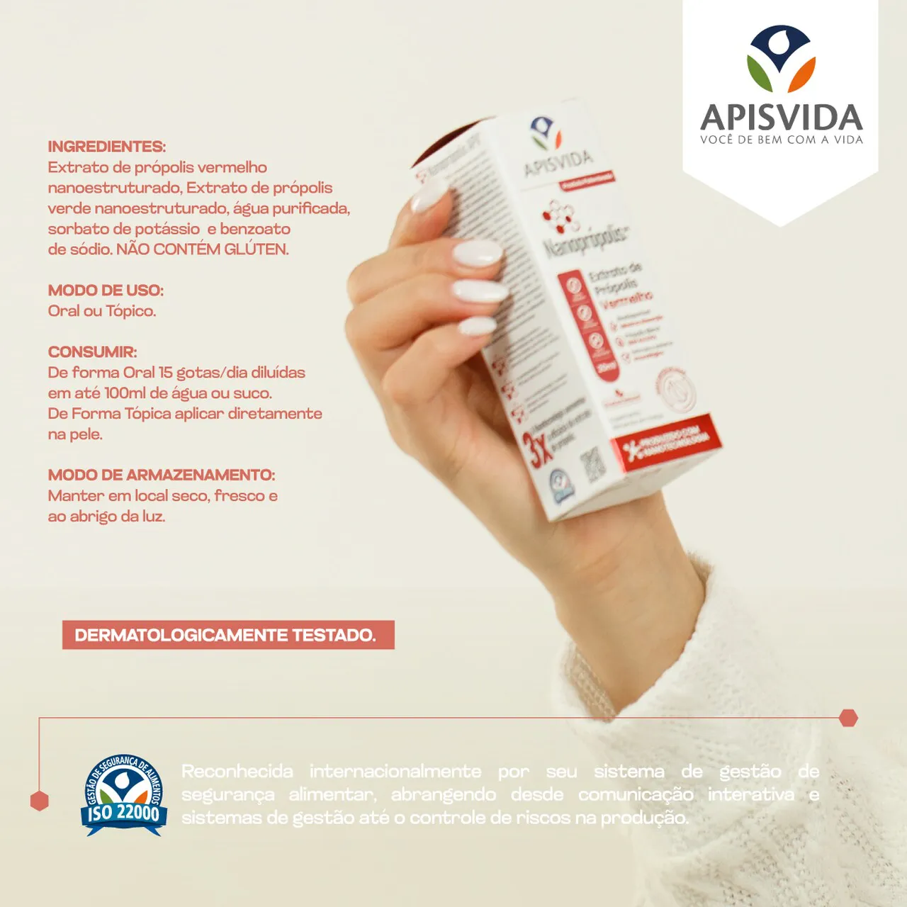 Nanoprópolis - extrato de própolis vermelho - é um poderoso blend de 55% de própolis vermelha e 45% de própolis verde, formulado com nanotecnologia exclusiva da APISVIDA. Essa inovação aumenta em até 3x a eficácia do extrato de própolis, garantindo a retenção de 99% dos ativos pelo organismo.