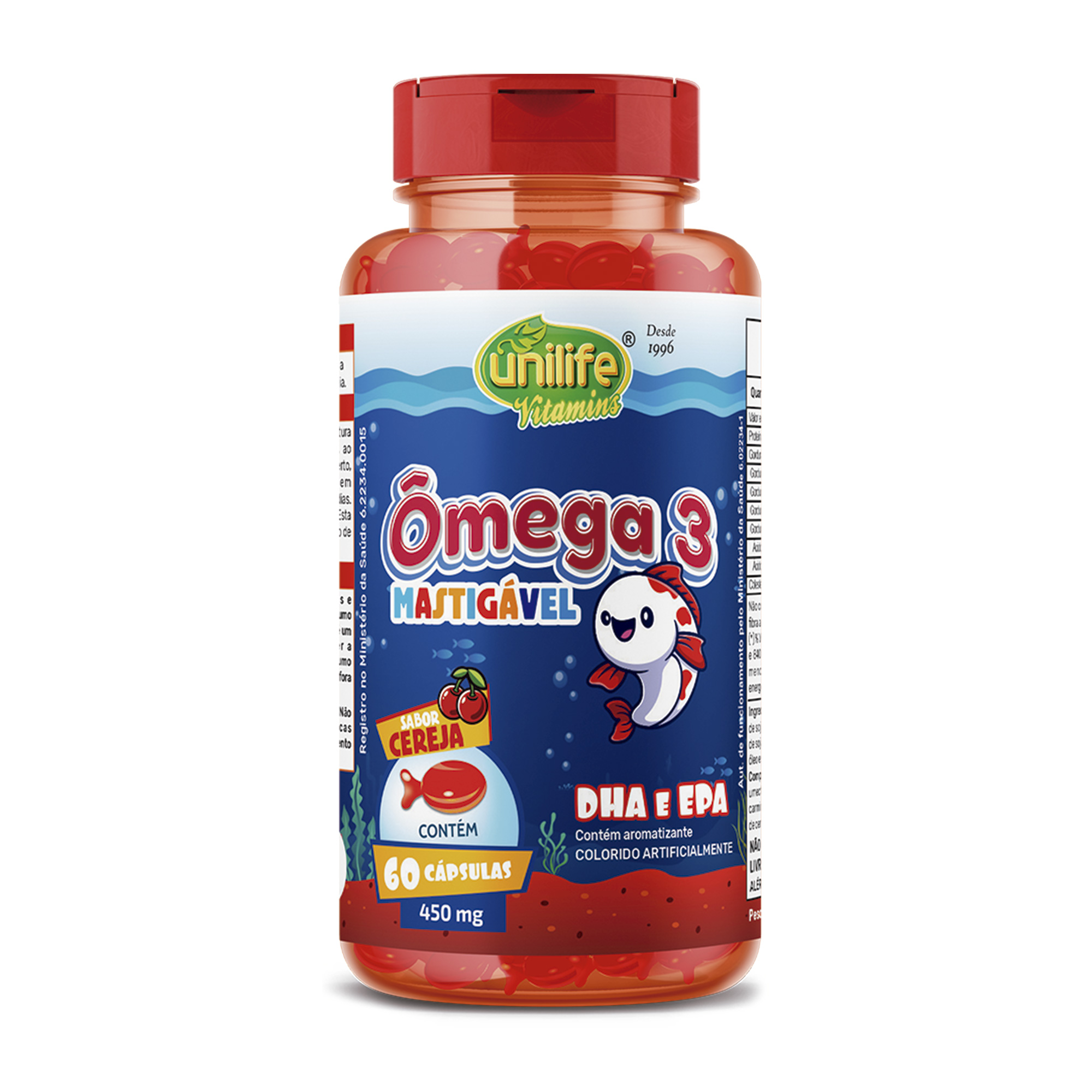 O Ômega 3 Mastigável Sabor Cereja Unilife Vitamins é um suplemento BIOKOSHER, desenvolvido a partir de óleo de peixe, óleo de coco, maltitol e óleo de soja. Livre de glúten.