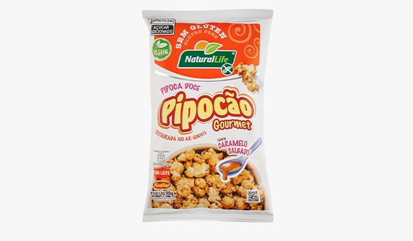 O Pipocão Gourmet é crocante, vegano, sem glúten e disponível em 4 deliciosos sabores: caramelo salgado, brigadeiro de panela, coco e churros.