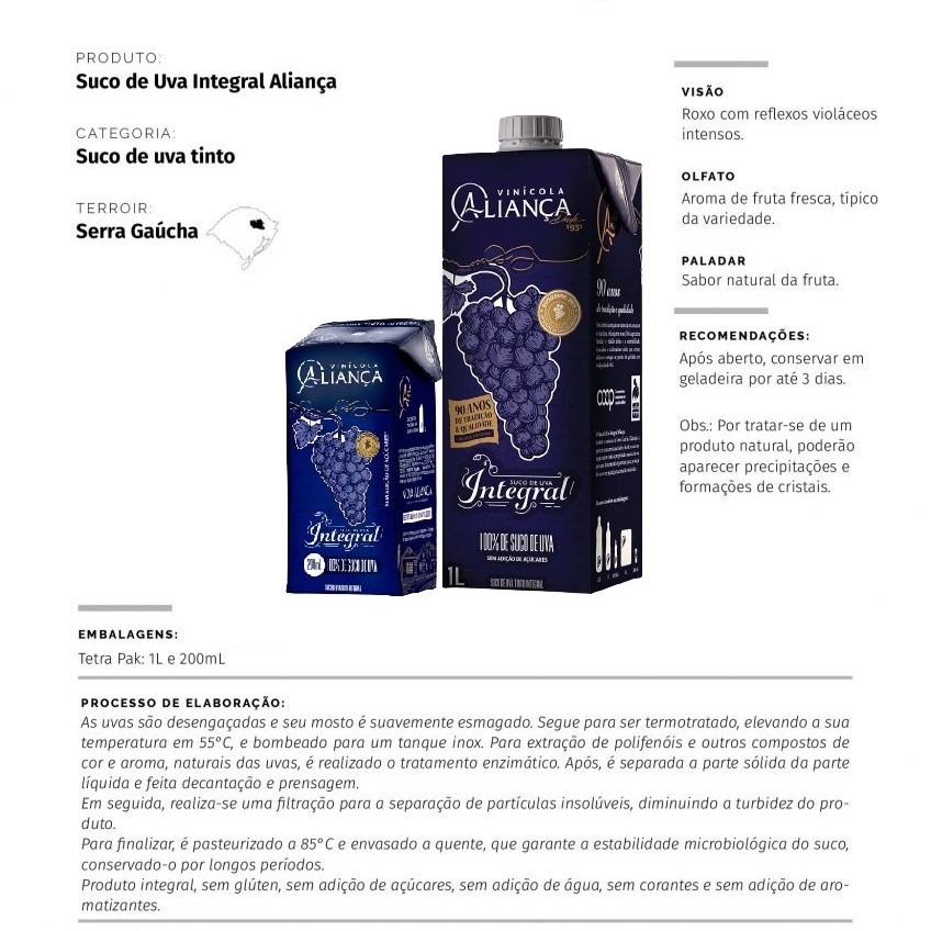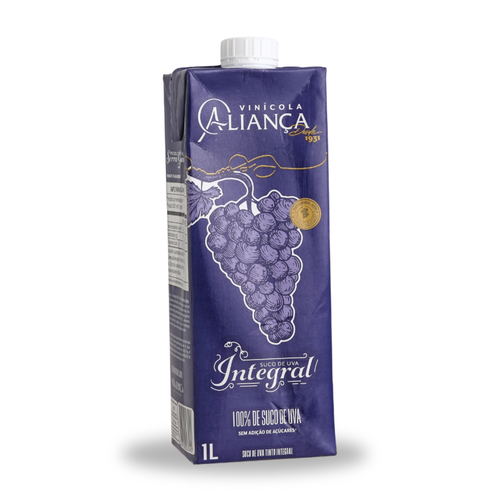 O Suco de uva Integral AliançaTinto 1L proporciona ao consumidor uma embalagem mais prática, que não pesa muito e não quebra.